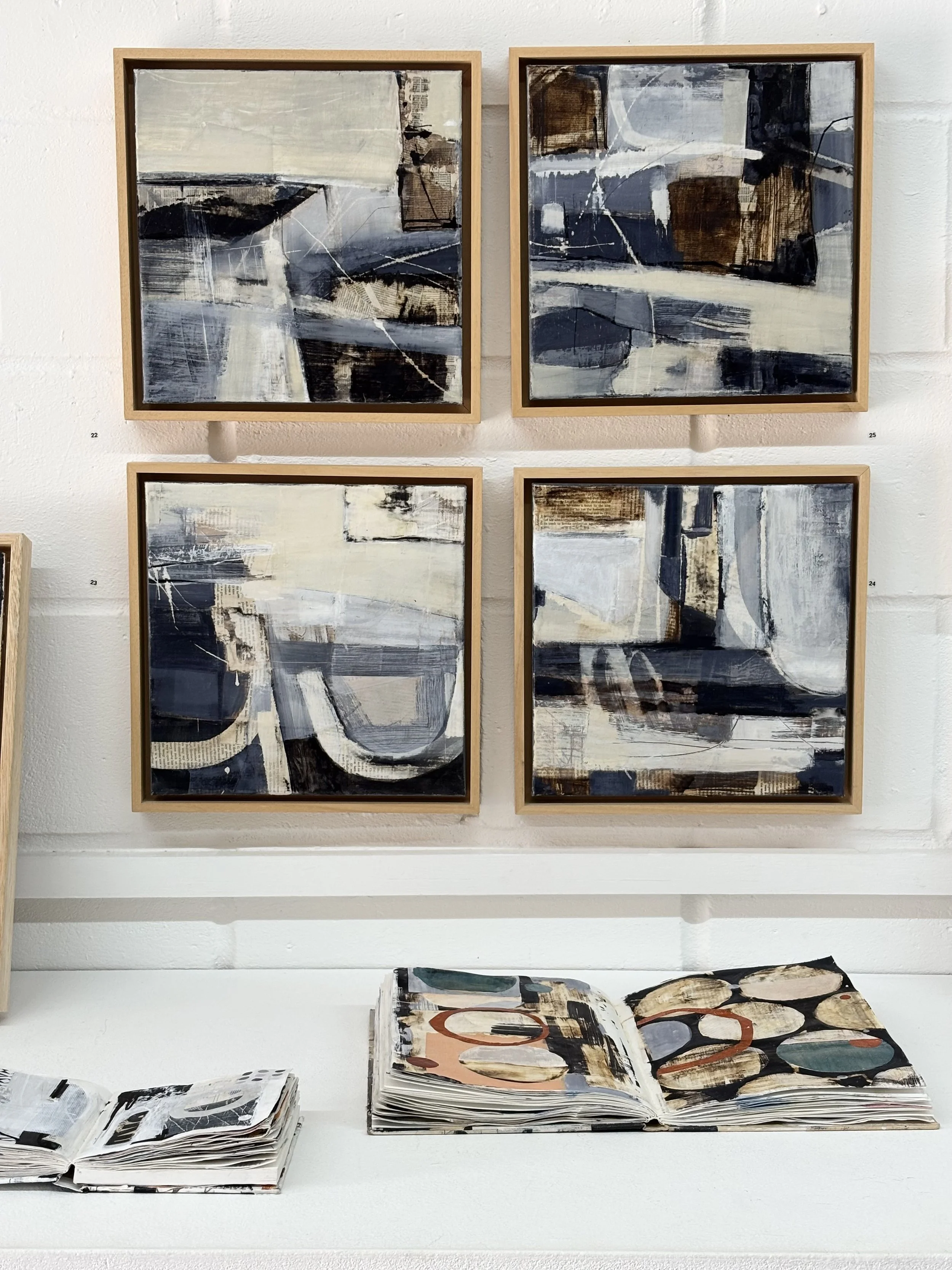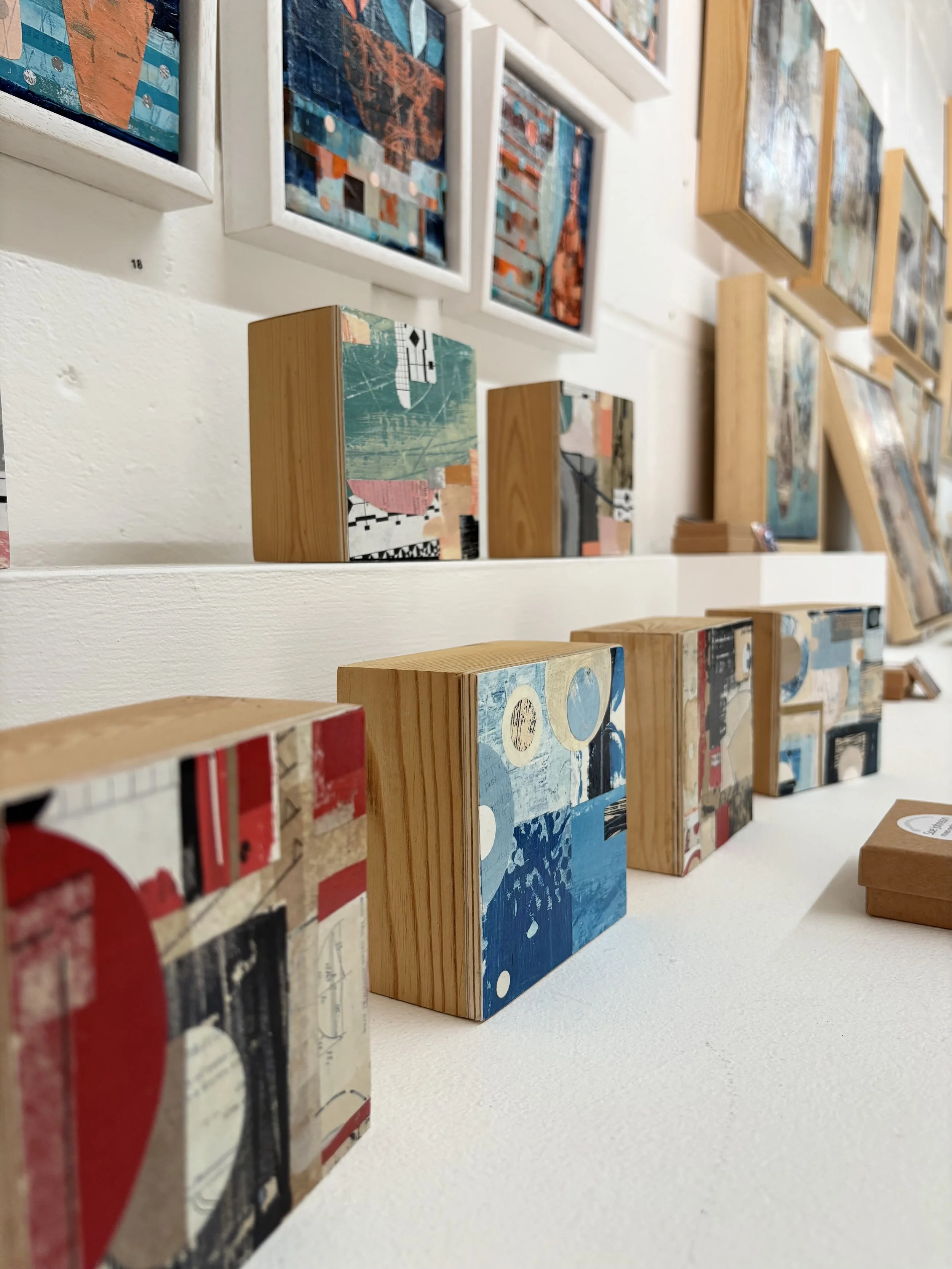 From there, I build up the surface—painting, layering, rearranging, and sometimes painting over areas if it’s not working. I work in multiples to stay loose and avoid overworking a single piece. It’s playful and full of surprises.